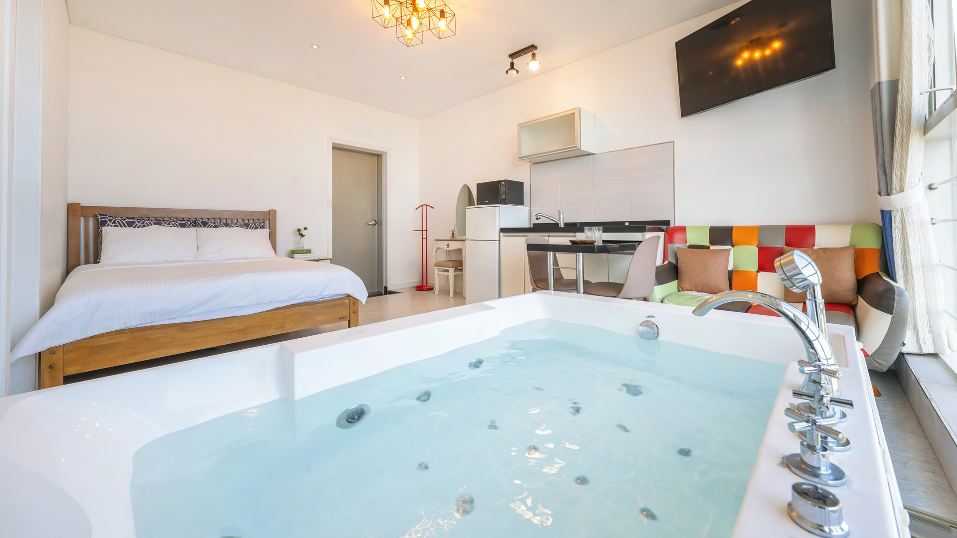- 집기품목 : 욕실용품, 남녀공용, TV, 금연, 냉장고, 에어컨, 전기밥솥, 취사시설/도구, 타월, 화장대, 스파/월풀, 식탁, 전자레인지, 바디워시, 샴푸, 린스, 치약, 커피포트, 화재 감지기, 2인실, 바다전망